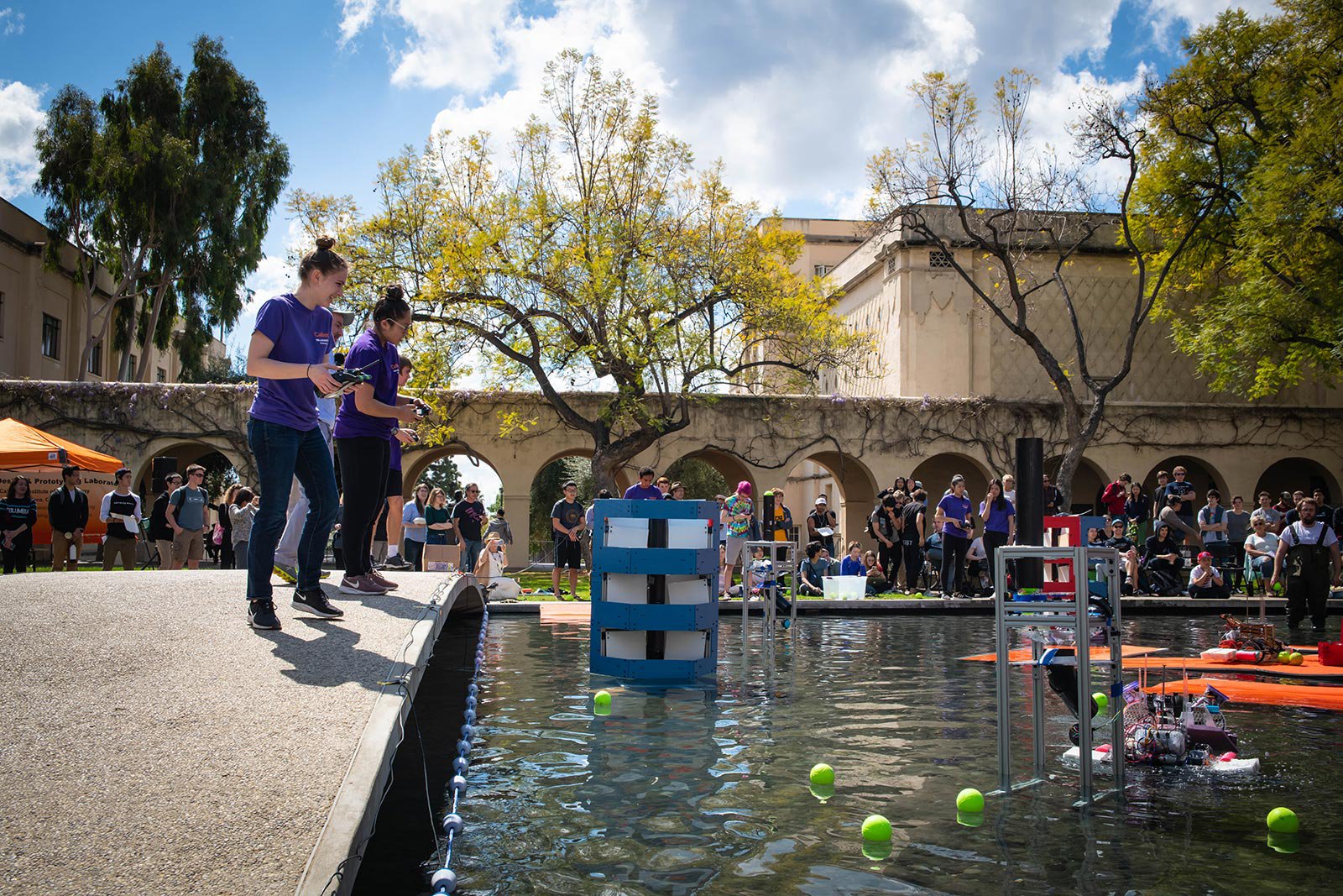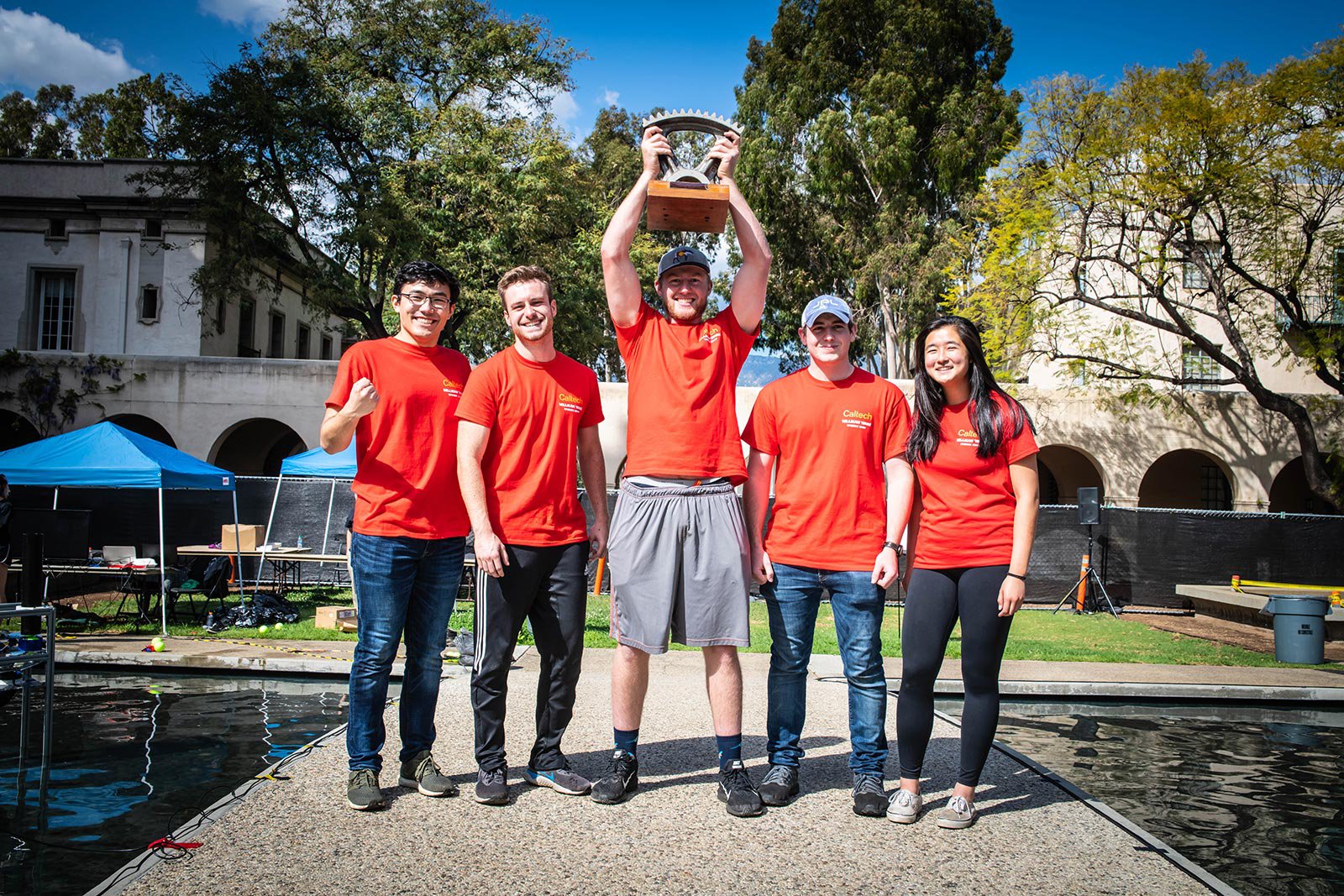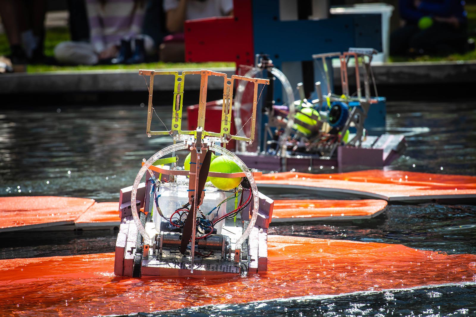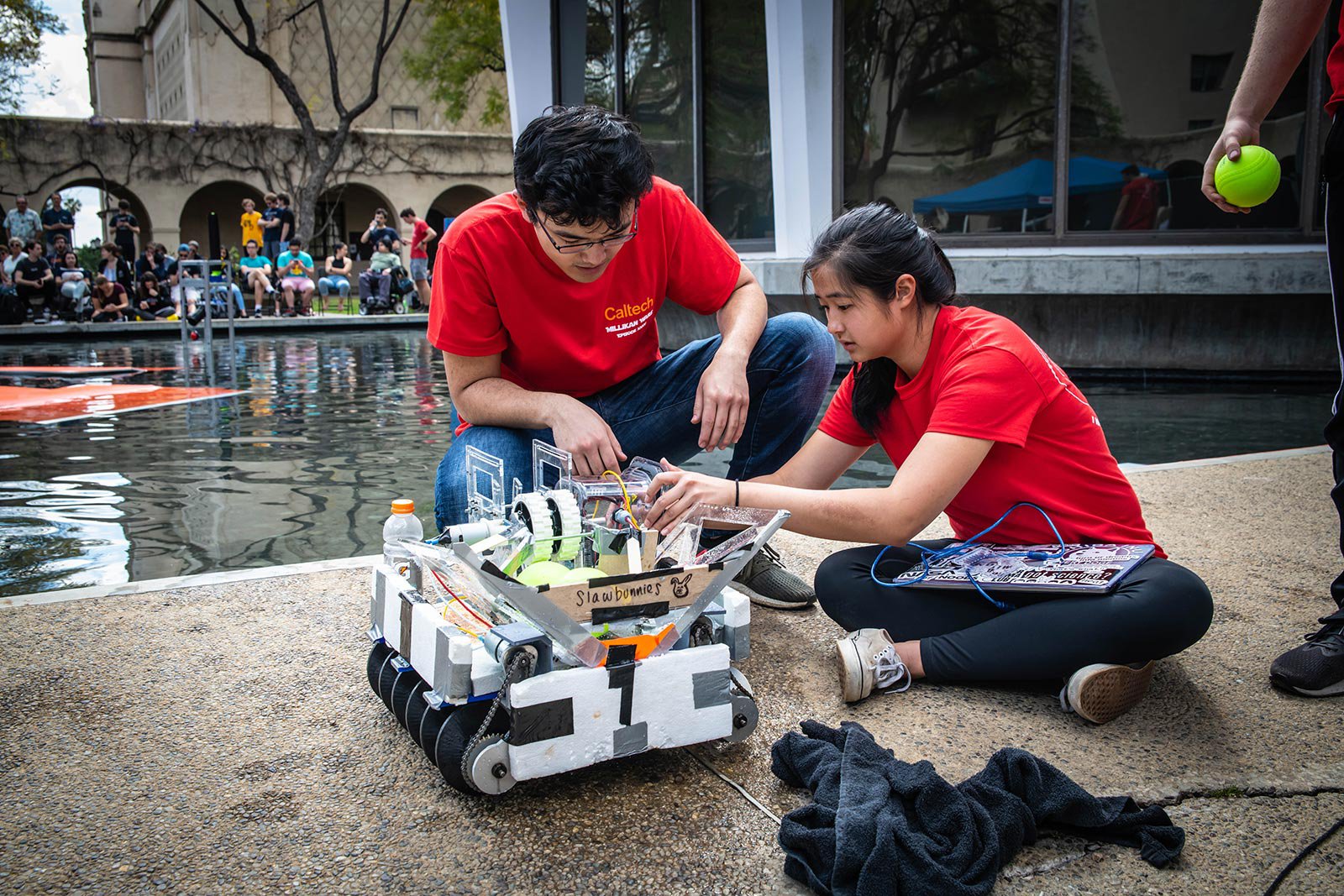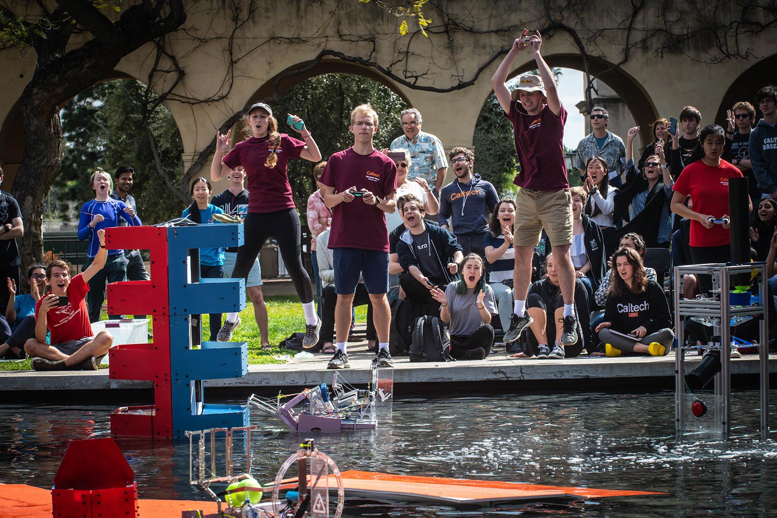 Five teams of Caltech undergraduates spent months building three amphibious remote-controlled robots per team that could drive into Millikan Pond and speed across the water to drop, shoot, or push balls into targets and outscore the opposing team. It was a high-stakes afternoon of capsizing, cheering, and triumph.