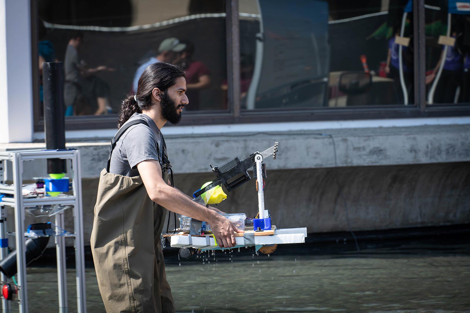 This was no simple course to navigate. Bots capsized during the first match and continued to get stuck throughout the afternoon, necessitating rescues by the TAs dressed in waders who patrolled the pond to referee and to rescue.