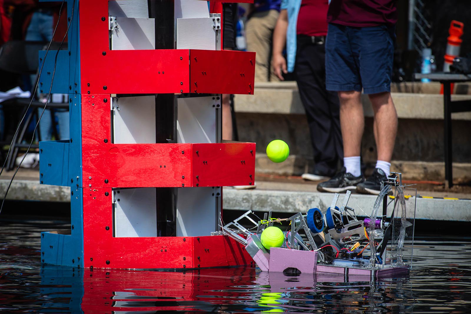 The robots had to drive into the pond, then navigate through the water to their targets: a series of three-tiered towers (in which landing a ball into the higher tiers offered an ascending number of points) and a center island that began rotating 45 seconds into each five-minute game, just to make it more challenging.