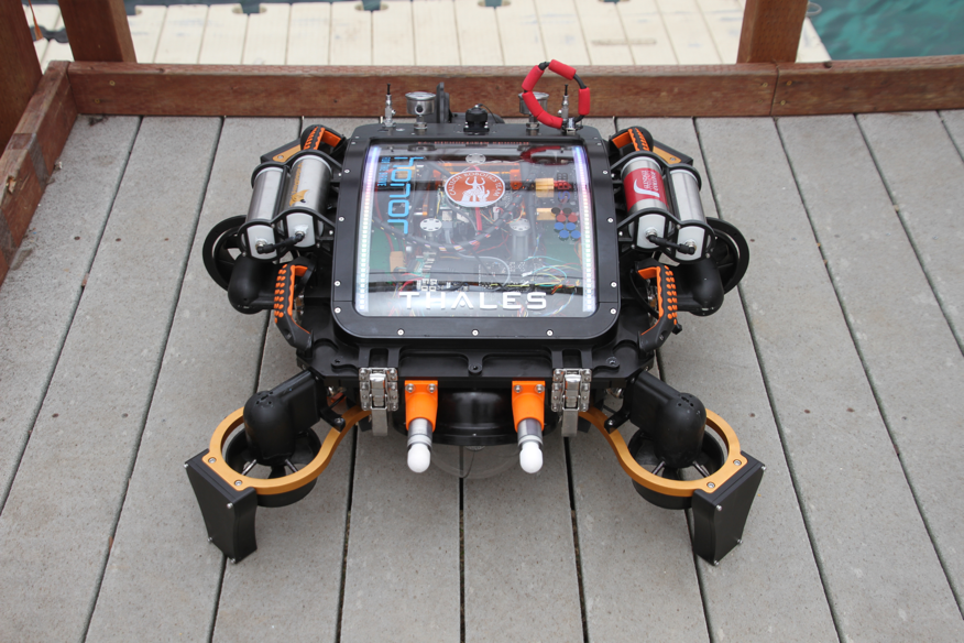 The Caltech team chose to redesign its submarine each year from the ground up—even though teams are allowed to re-enter submarines, tweaking them to build on past successes. This year's submarine, which features seven thrusters, two grippers, a hydrophone, and other sensors, took nine months and about $75,000 to build.