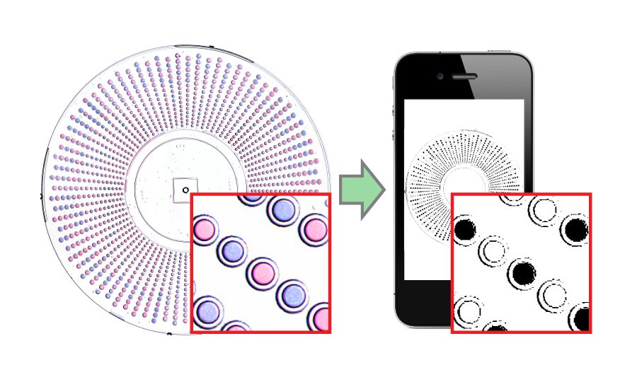 To read the result, a user simply takes a picture of the entire SlipChip using any camera phone. Then the photo is processed using a ratiometric approach that transforms the colors detected by the camera's sensor into an unambiguous readout of positives and negatives.