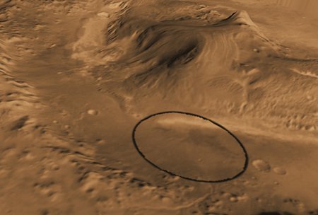 The crater is nearly 100 miles in diameter and is home to a layered mountain three miles high. Clay minerals form the lower layers while sulfur and oxygen-bearing minerals sit above. Channels carved into the mountain and the crater wall suggest that water once flowed through the region. The car-sized Curiosity rover will land at the foot of the mountain and slowly make its way up, exploring it layer by layer.