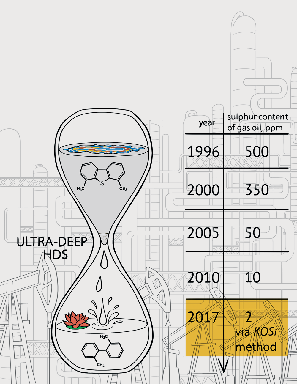 As described in the Nature Energy paper, Toutov and his colleagues in the Grubbs lab have used the potassium salt method to remove sulfur from carbon compounds found in diesel fuel. They partnered with BP to test their method on the company's refined diesel samples, reducing the sulfur levels down from 8 parts per million (comparable to the highest quality of diesel you can get from a typical gas pump today) to an extremely low 2 parts per million. They also repeated the experiment with diesel spiked with high levels of sulfur and achieved similar results.