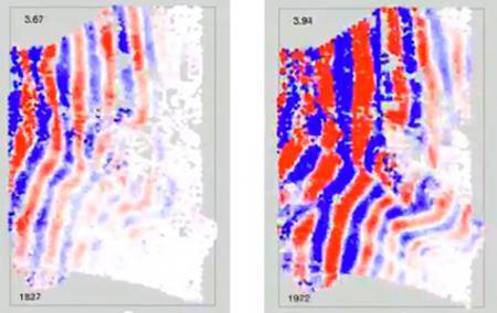 The survey crew worked weekdays from 9:00 to 4:00, but the seismometers ran 24/7. The array straddled the Newport-Inglewood fault zone, the source of the disastrous 1933 quake that killed 115 people. "The earth is constantly chattering away down there," says Clayton, and the network caught hundreds of after-hours tremors, including a magnitude 2.4 under nearby Carson. A color-coded video of this hiccup shows the seismic waves propagating eastward block by block, station by station. The waves distort as they encounter the fault, whose segments reveal themselves as fleeting white scars in the sea of red and blue.