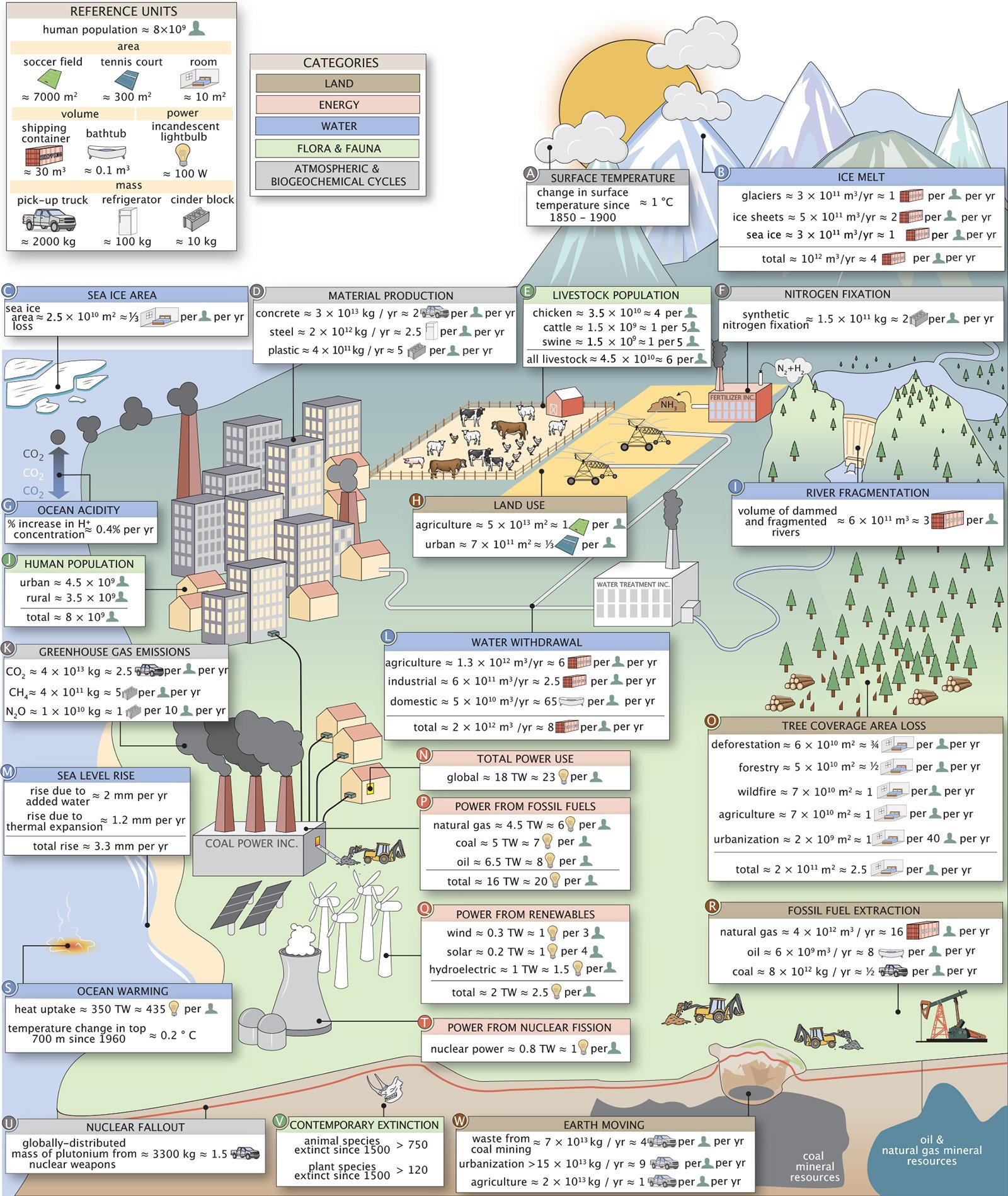 Now, Caltech researchers have developed a database containing global data on how humans have impacted the planet. The Human Impacts Database is designed to be accessible to scientists, policymakers, and everyday citizens, and provides information ranging from global plastic production (4 x 1011 kilograms per year), to the number of cattle on Earth (about 1.6 billion), to global annual mean sea level rise (approximately 3.4 millimeters per year). The data are broken into five main categories: water, energy, flora and fauna, atmospheric and biogeochemical cycles, and land. These also include 20 subcategories. Where available, the database includes time series to help illustrate how these numbers have changed through the years.